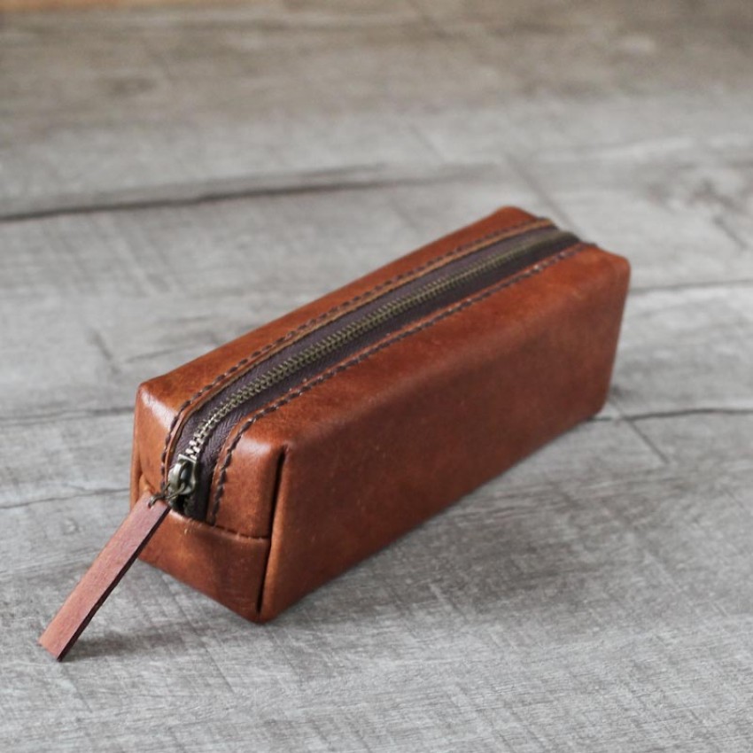 咖啡棕色立體植鞣牛皮革筆袋 (中型)